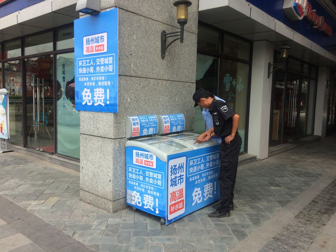 86日起,針對高溫天氣,珍園街區(qū)攜手揚州生活網(wǎng),共同發(fā)起“愛心冰箱送清涼活動,免費為環(huán)衛(wèi)工人、交警同志、快遞小哥、外賣小哥等廣大室外一線工作者提供冷飲、礦泉水等降溫補給品展示企業(yè)社會責(zé)任,展示揚州城市關(guān)懷。