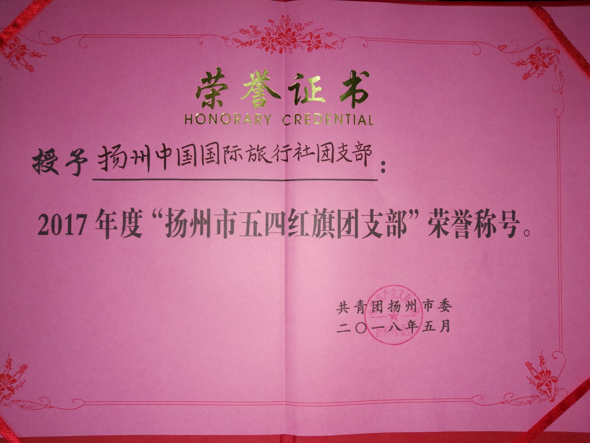 揚(yáng)州國旅榮獲“揚(yáng)州市五四紅旗團(tuán)支部”稱號
