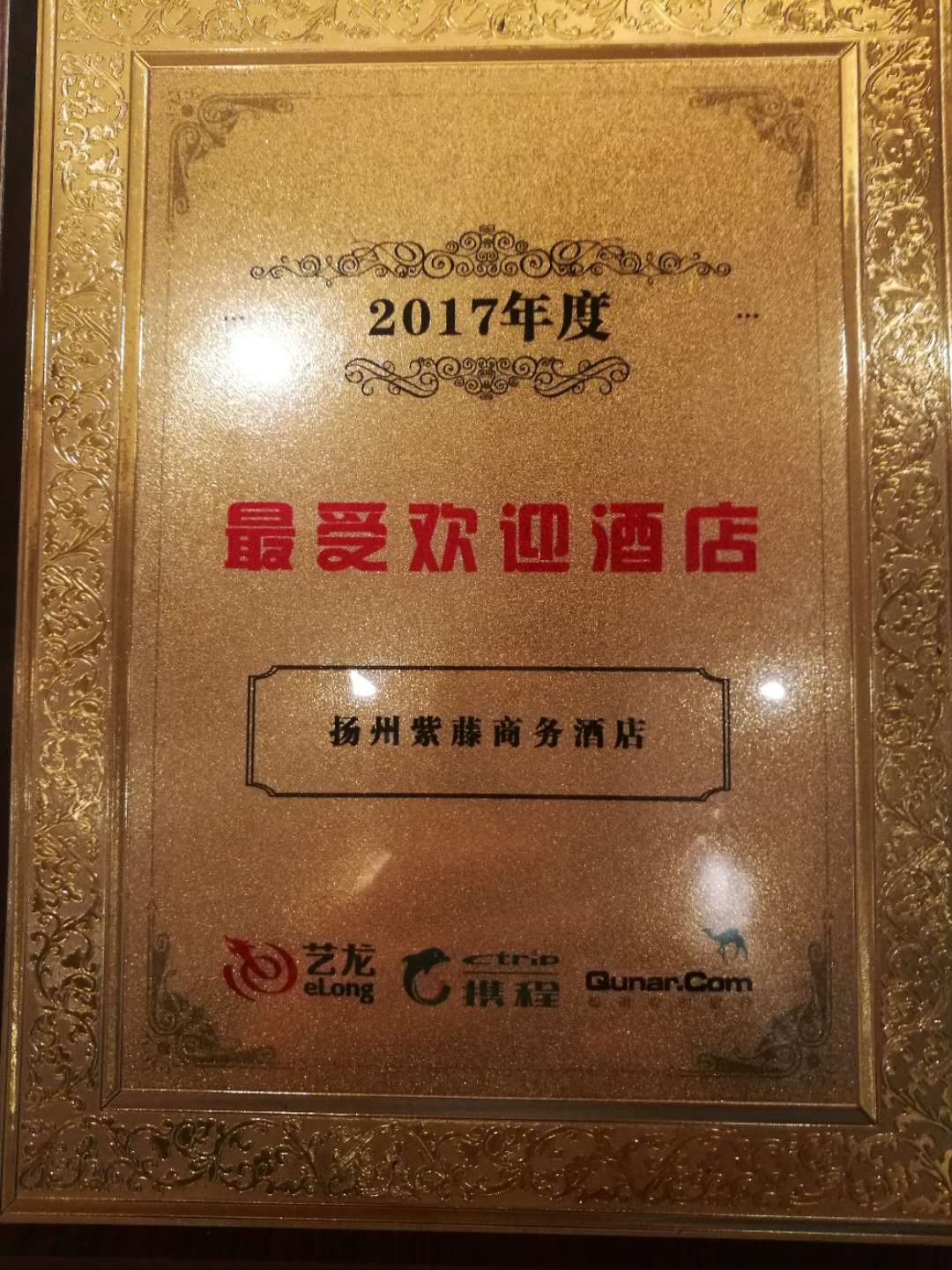 紫藤商務酒店榮獲“攜程旅行網(wǎng)2017年度最受歡迎酒店獎