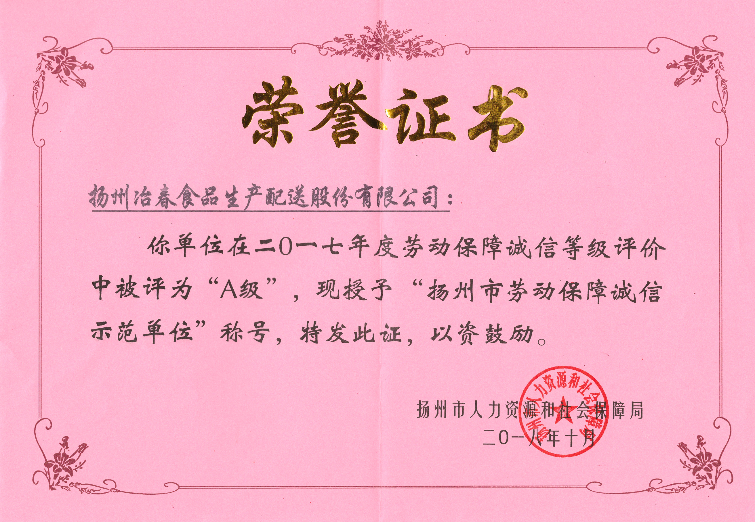 近日,冶春食品公司在揚州市人力資源和社會保障局組織開展的2017年勞動保障守法誠信等級評價工作中被評為A級,榮獲“揚州市勞動保障誠信示范單位”稱號。