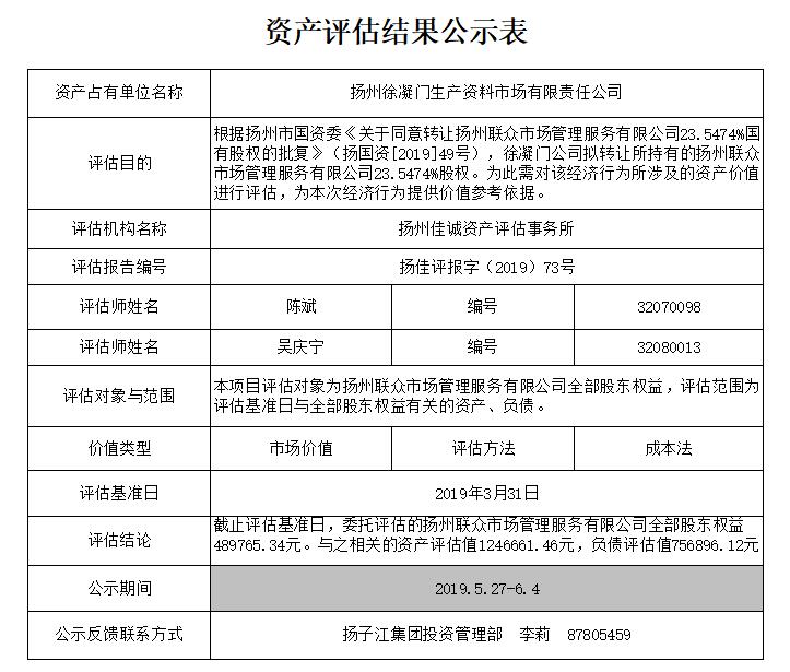 關(guān)于擬轉(zhuǎn)讓揚州聯(lián)眾市場管理服務(wù)有限公司23.5474%國有股權(quán)的公告