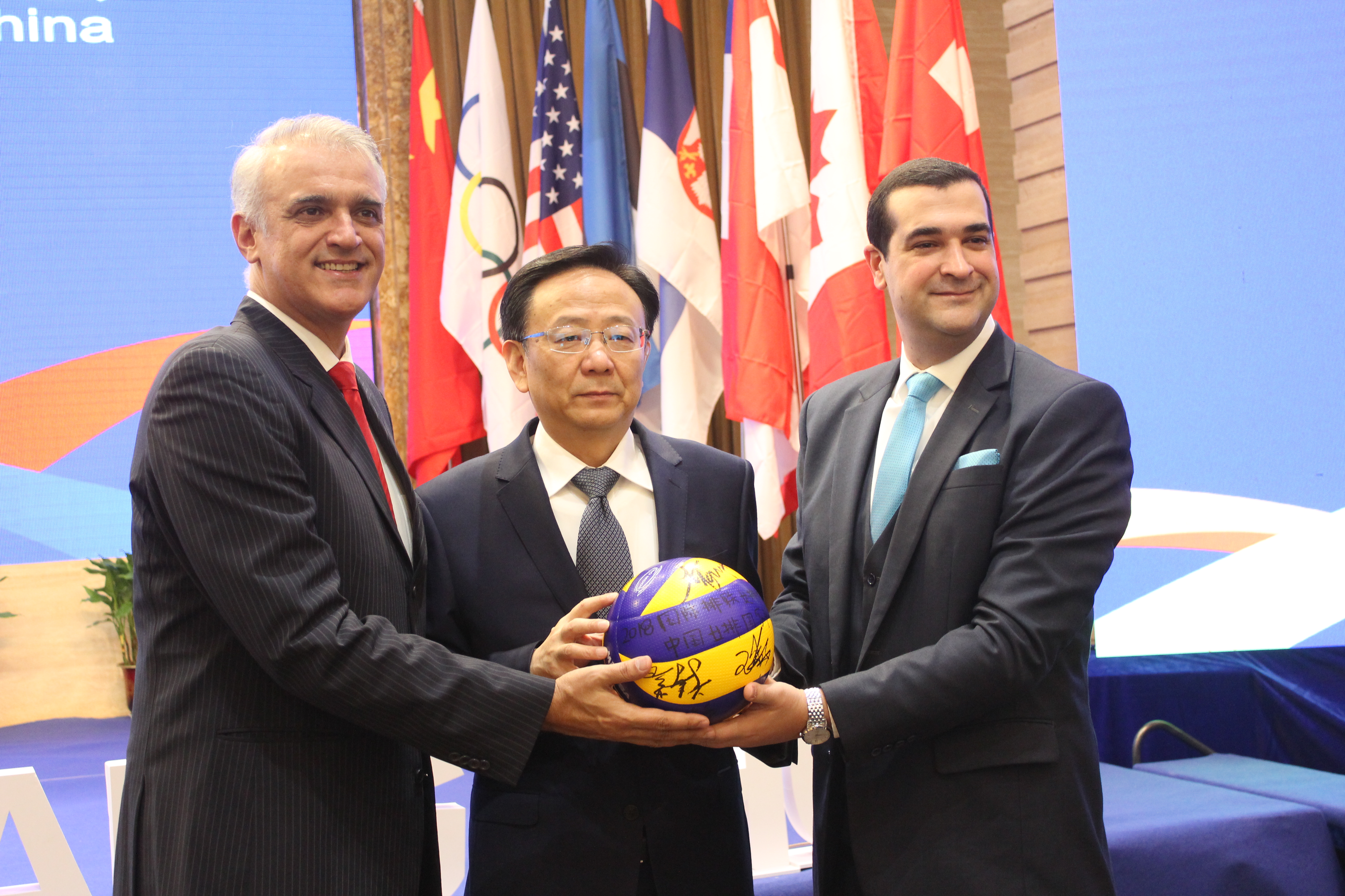 ![]() (國際排聯(lián)商務(wù)主管馬里奧-梅德羅斯向揚(yáng)州市代市長夏心旻贈送排球)