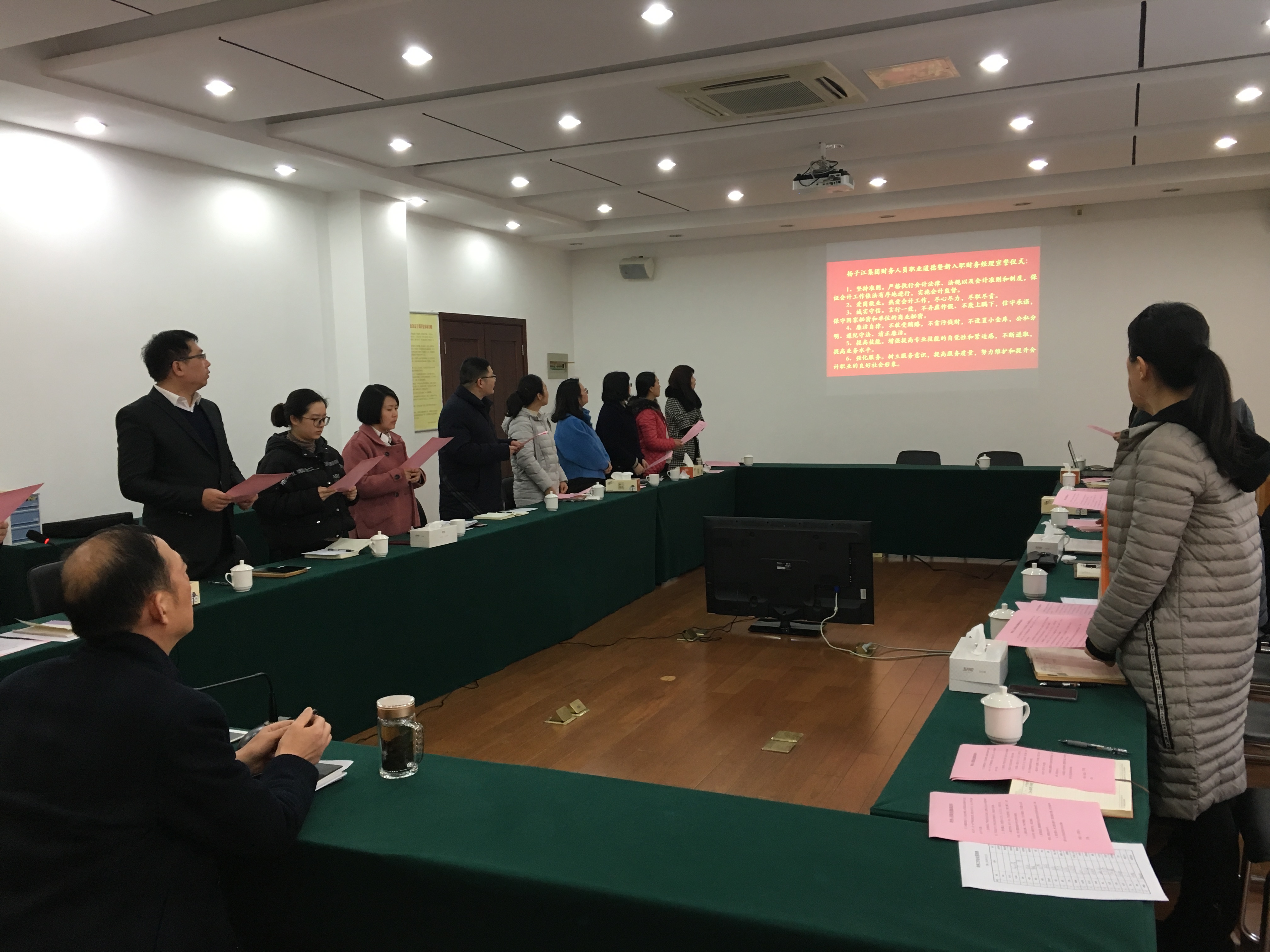 3月12日下午,集團(tuán)二樓會(huì)議室召開2019年度財(cái)務(wù)工作會(huì)議,會(huì)上舉行了集團(tuán)財(cái)務(wù)人員職業(yè)道德暨新入職財(cái)務(wù)經(jīng)理宣誓儀式。集團(tuán)總經(jīng)理蔡余良、紀(jì)委書記劉惠謙出席會(huì)議。集團(tuán)財(cái)務(wù)部及委派財(cái)務(wù)經(jīng)理參會(huì)